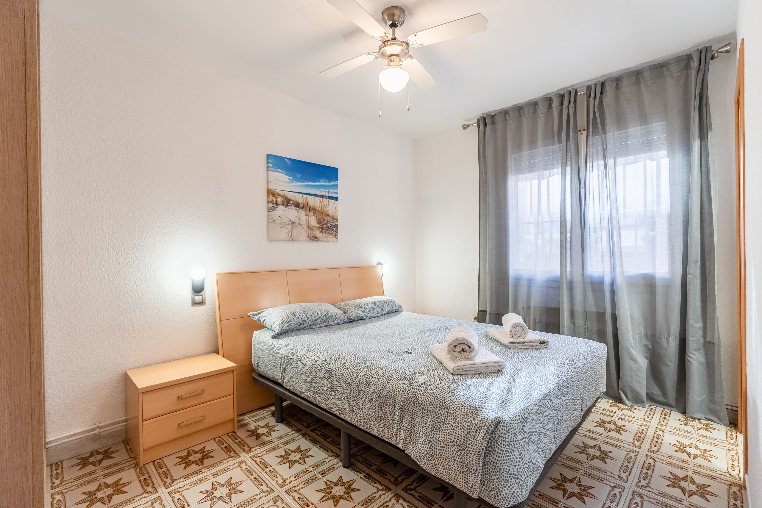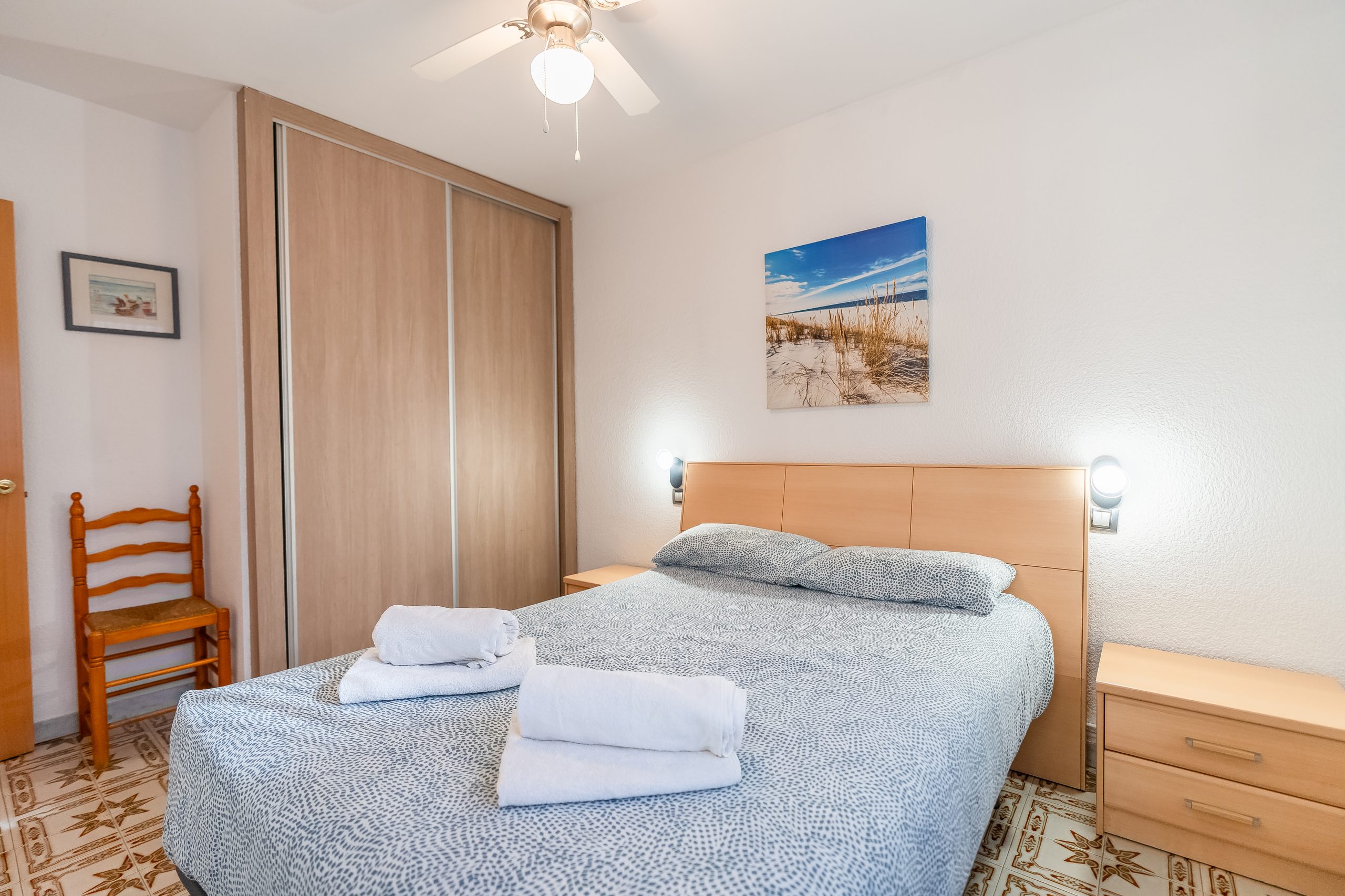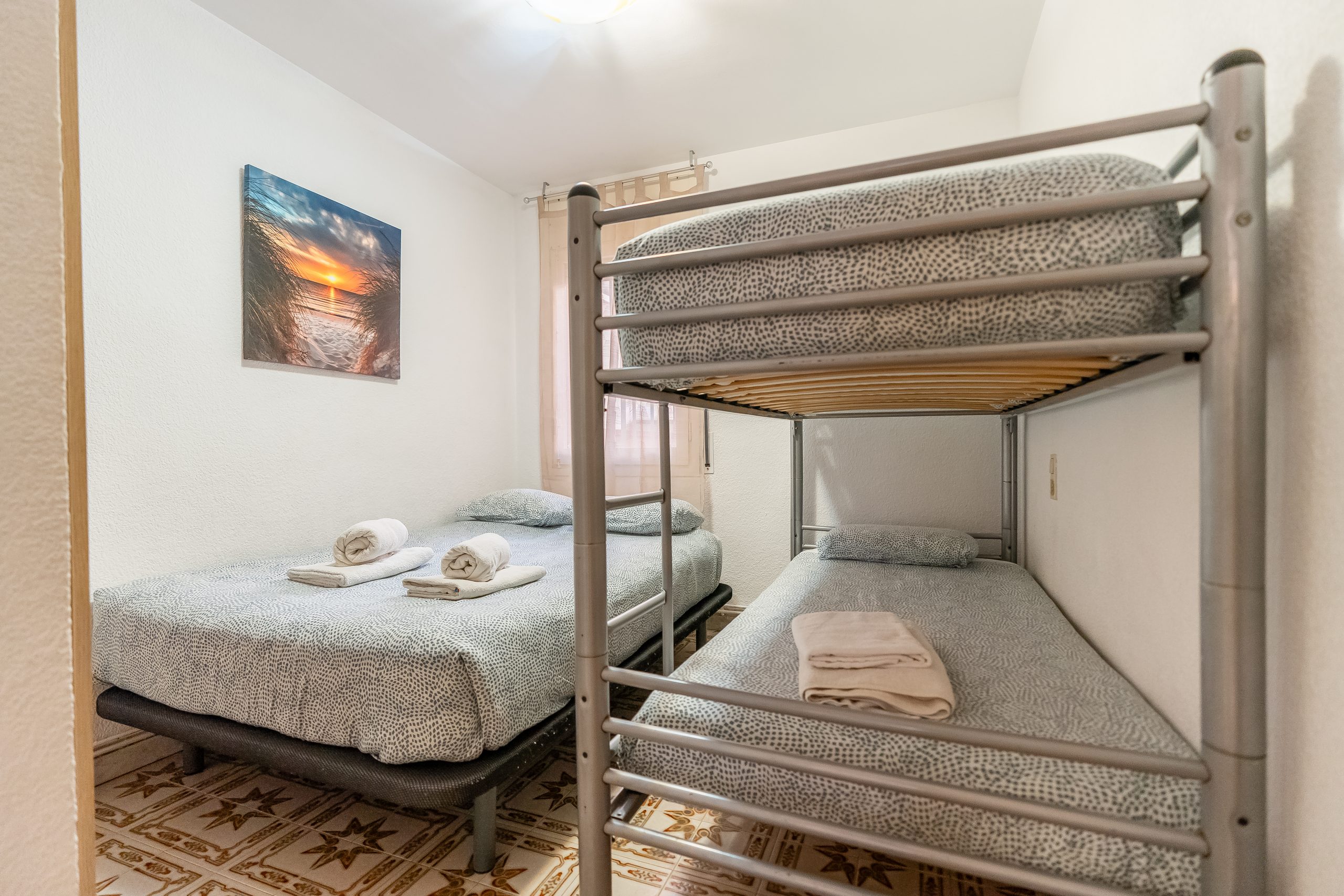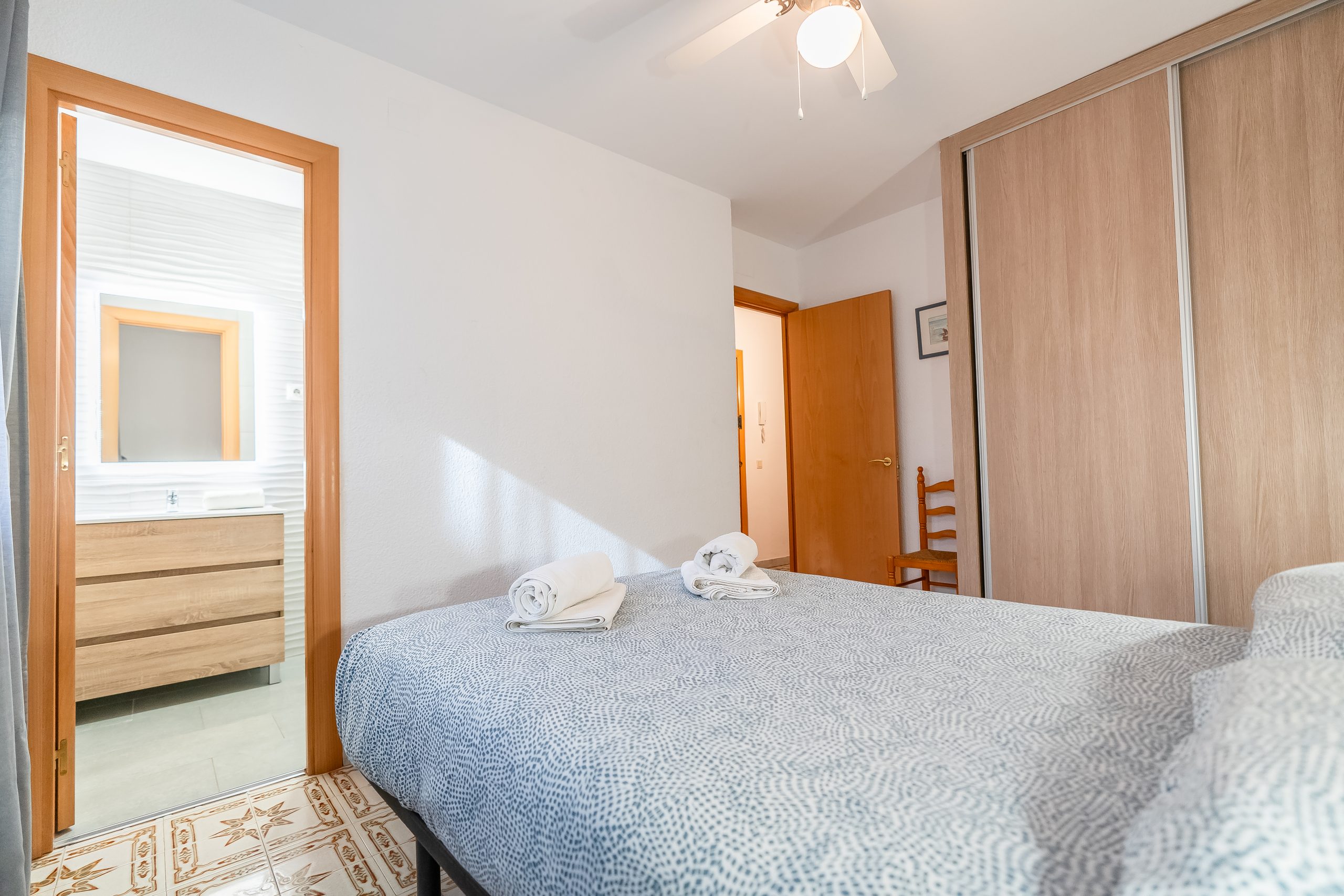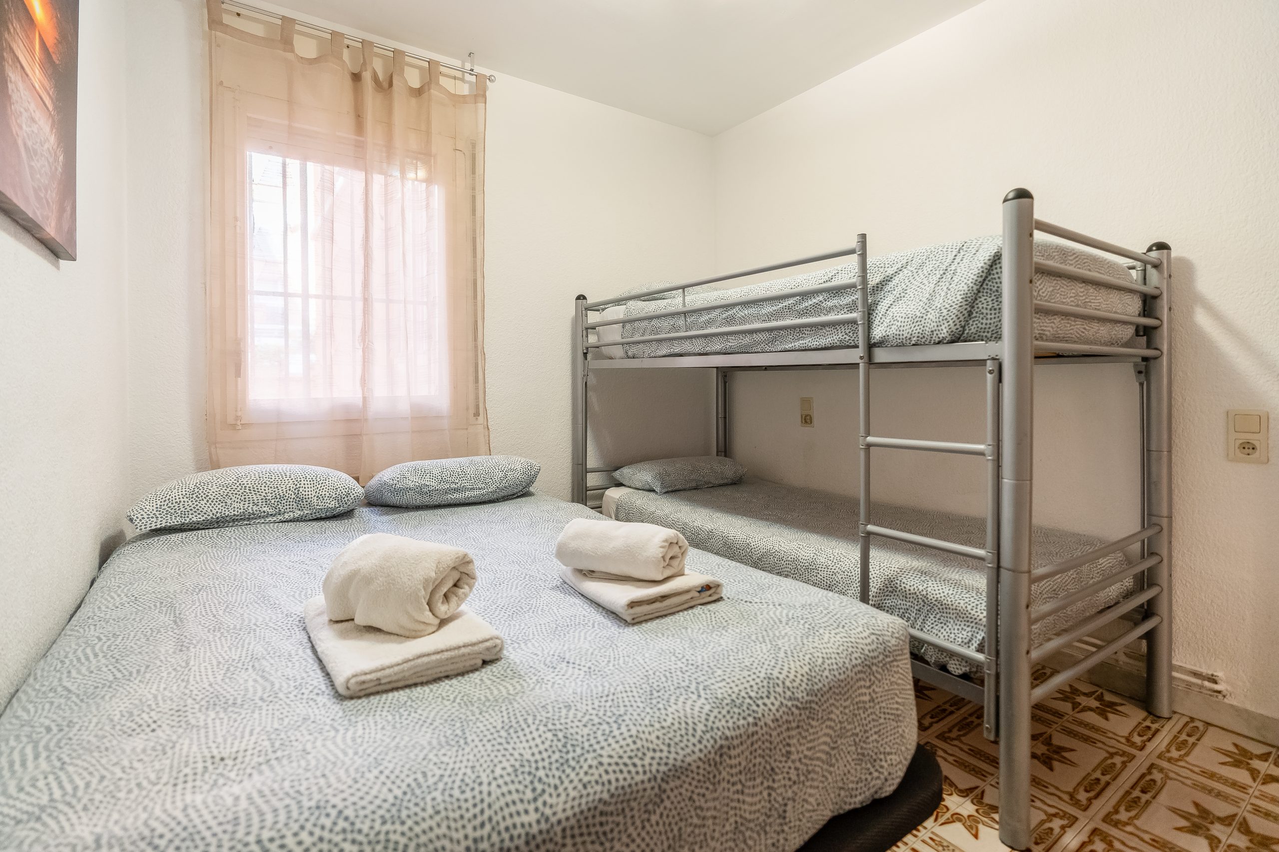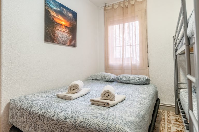 El alojamiento cuenta con 3 dormitorios amplios y luminosos, configurados para alojar cómodamente a 6 personas. Dispone de dos habitaciones con cama doble y una tercera con dos camas individuales, además de 2 baños completos que garantizan la privacidad de todos los huéspedes. El salón-comedor destaca por su acceso directo a una terraza privada, el lugar perfecto para desayunar contemplando el Mediterráneo o relajarse tras un día de sol.