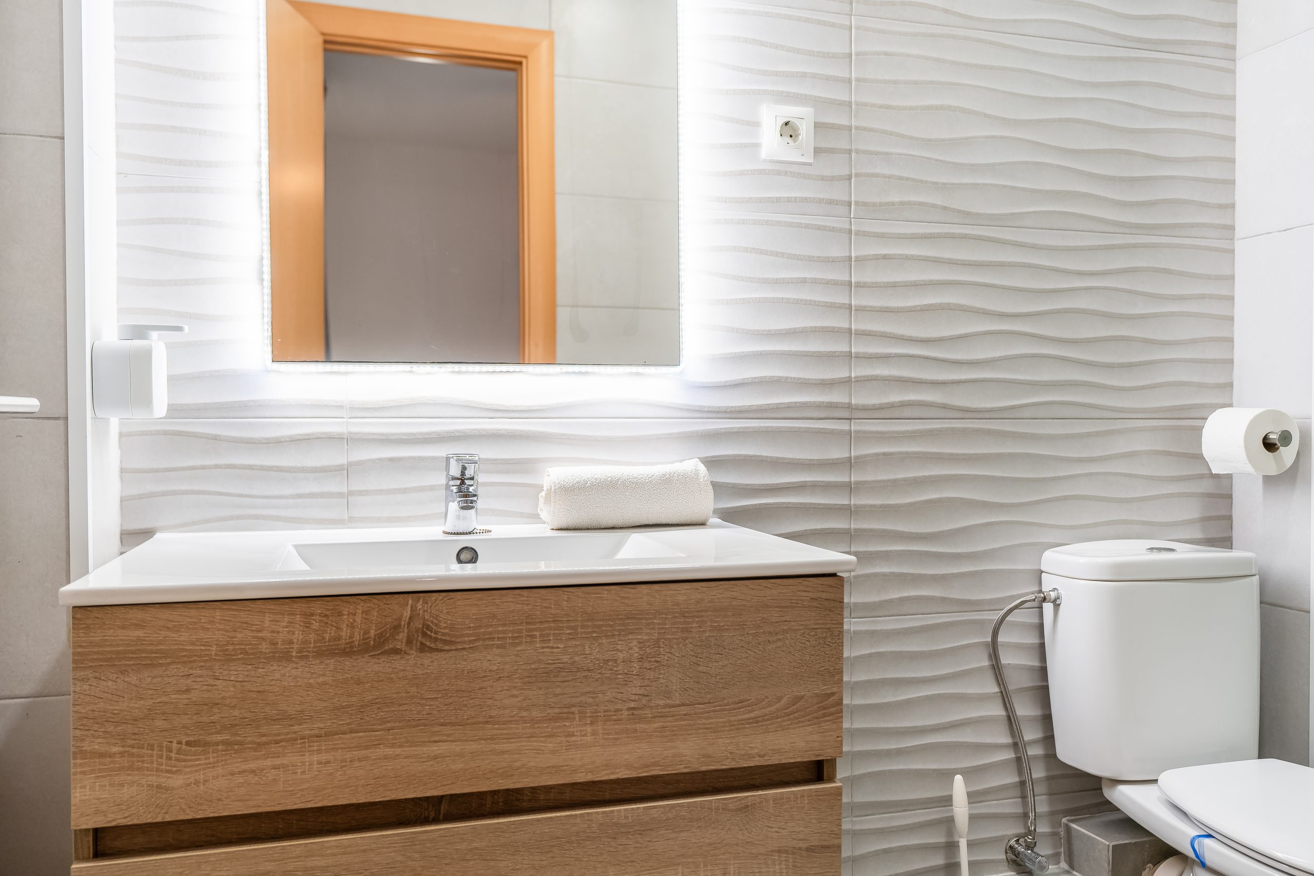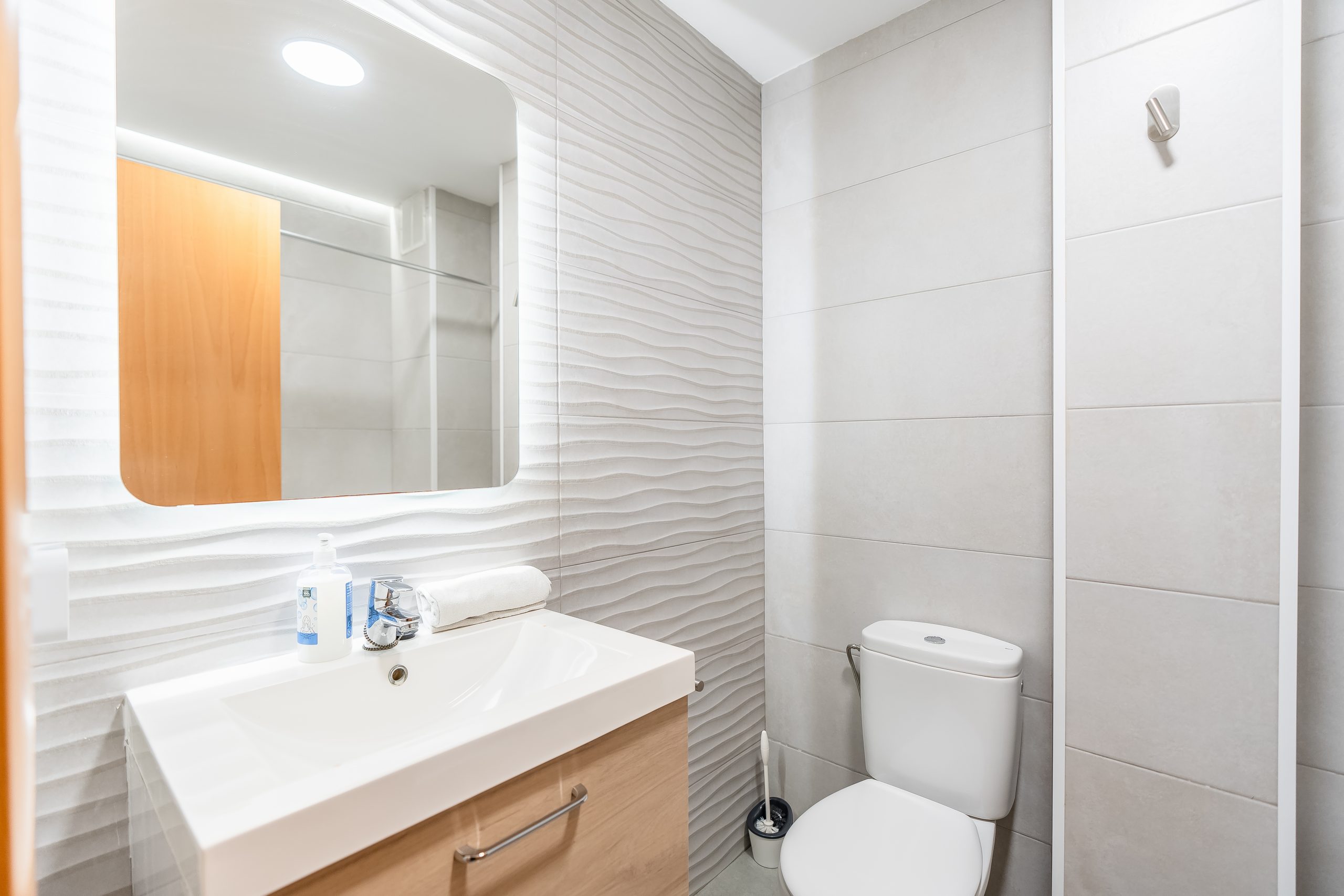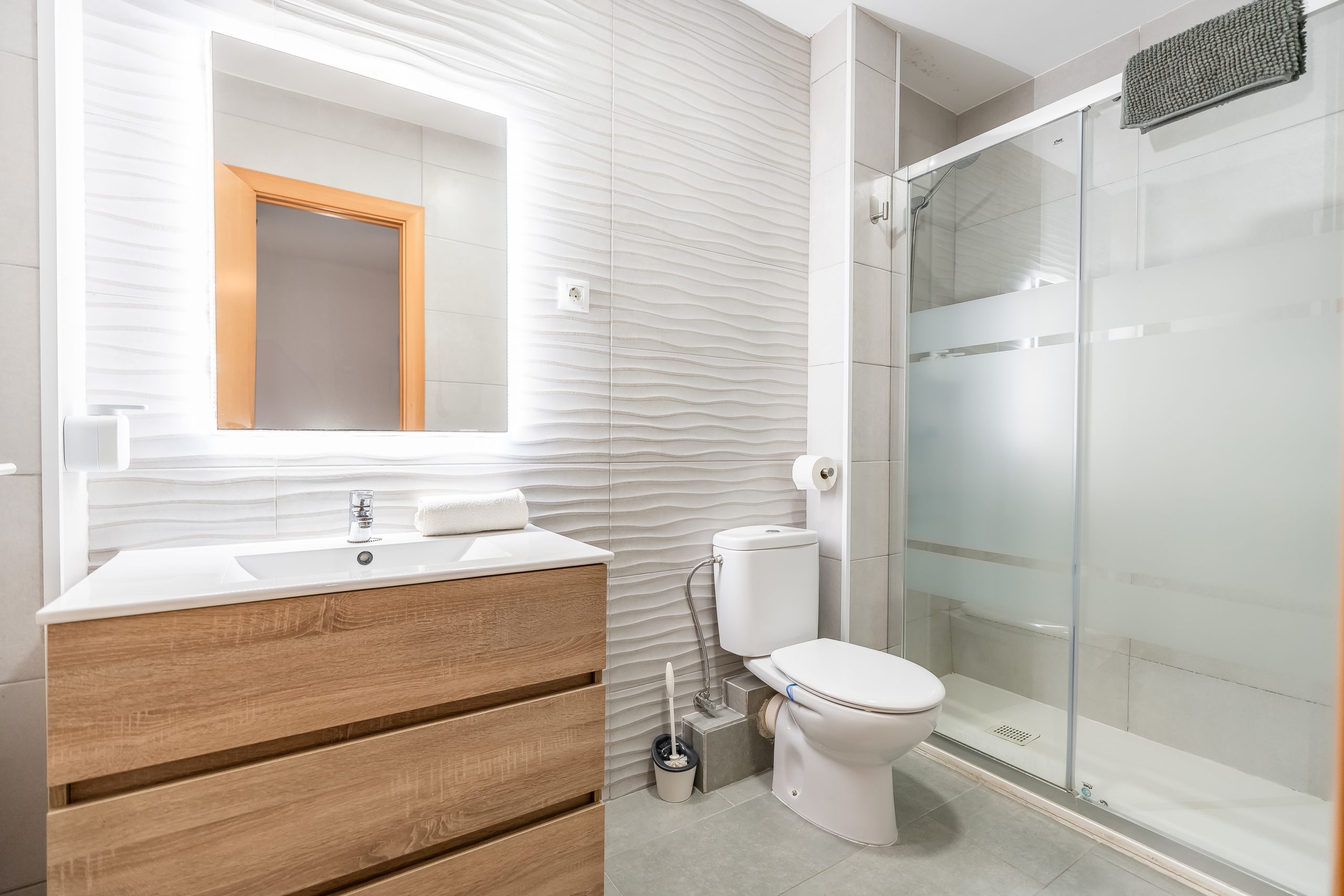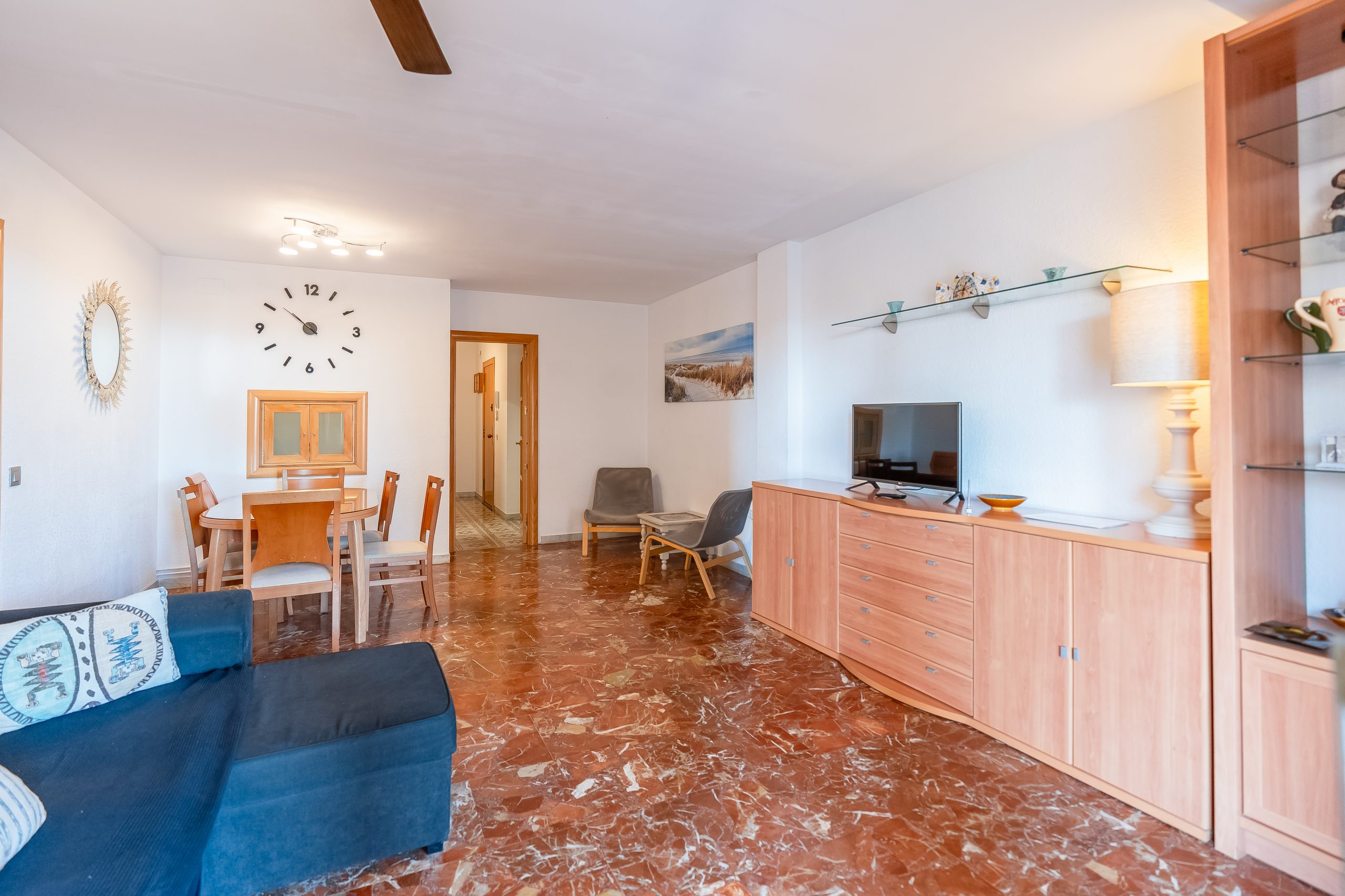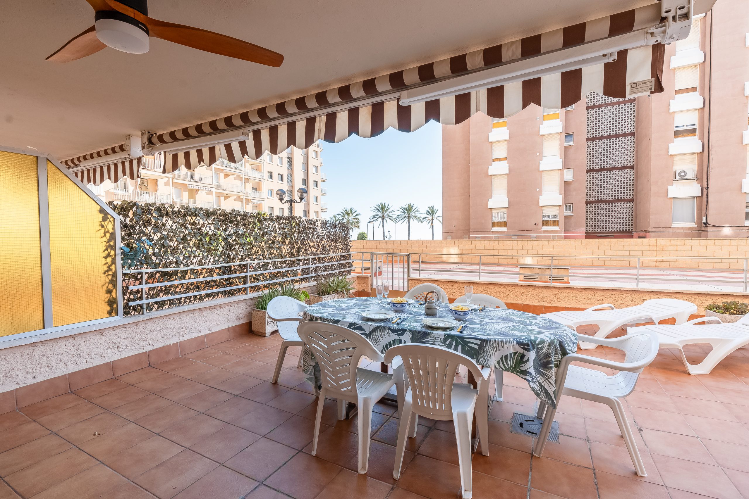 El alojamiento cuenta con 3 dormitorios amplios y luminosos, configurados para alojar cómodamente a 6 personas. Dispone de dos habitaciones con cama doble y una tercera con dos camas individuales, además de 2 baños completos que garantizan la privacidad de todos los huéspedes. El salón-comedor destaca por su acceso directo a una terraza privada, el lugar perfecto para desayunar contemplando el Mediterráneo o relajarse tras un día de sol.